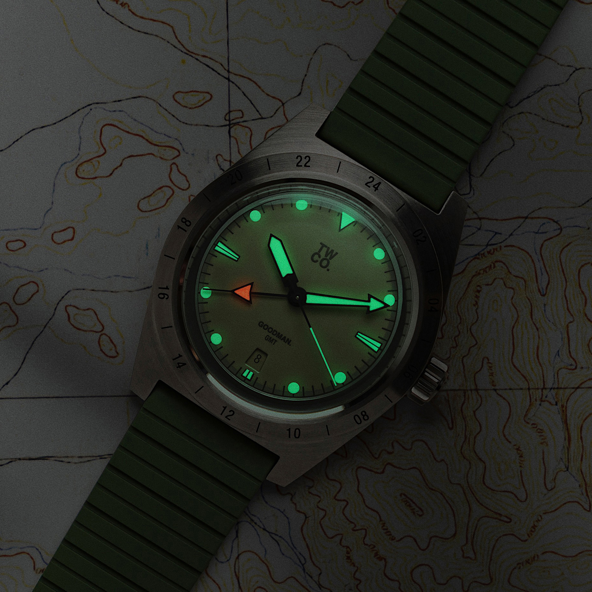 The TWCO. Goodman GMT is a collaboration between Tool Watch Co. and Los Angeles content creator Jory Goodman, better known as The Time Teller, forged from the same Damage Doctrine philosophy that has driven his fight to rebuild after a life-altering injury.